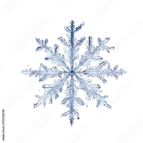 A rimed snowflake, frozen droplets distorting its symmetry into a surreal, jagged sculpture