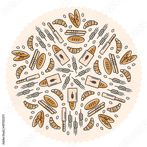 A ring of bread badges. Vector icons in a circle, a round pattern of bread, baguettes, loaves, rye, wheat, ears. Bakery design.