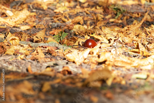 a ripe chestnut fallen from a tree lies on the ground among the autumn foliage