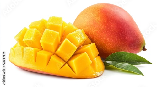 A ripe mango cut into cubes next to a whole mango with green leaves.