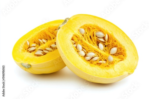 A ripe yellow spaghetti squash cut in half, showing the seeds, isolated on white