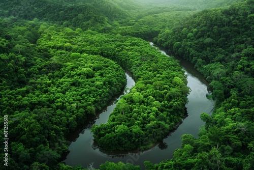 A river meanders through a dense, vibrant green forest with a lush canopy of trees overhead, A lush, green forest with a canopy of trees overhead and a winding river cutting through the landscape