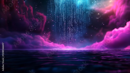 A river of binary code (1s and 0s) flowing through a holographic futuristic landscape, glowing in bright cyan and purple, surrealism, vivid colors
