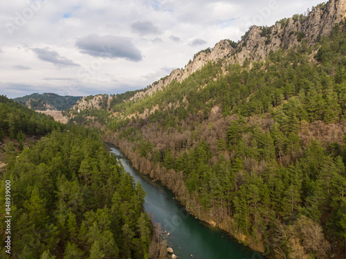 A river running through the centre of a valley, surrounded by pine trees. Cloudy sky.