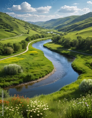 A river runs through a valley with wildflowers and trees