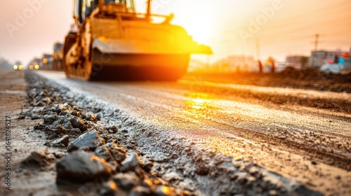 A road roller compacts fresh asphalt on a road during sunset, creating a smooth surface in warm, golden light