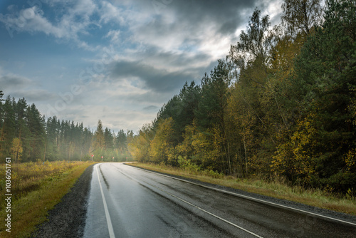 A road with trees in the background and a cloudy sky
