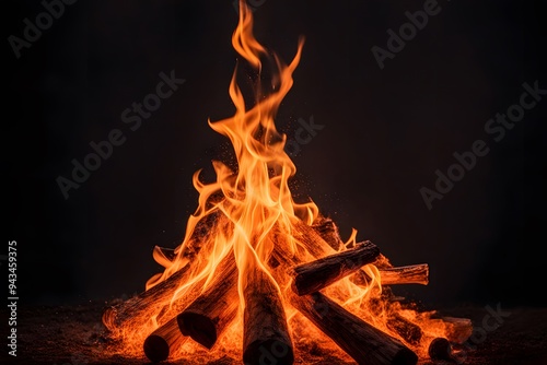 A roaring bonfire with tall orange flames rising against a dark background, Ai Generated
