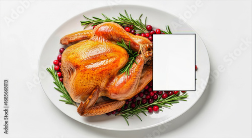 A roasted chicken garnished with rosemary and cranberries served on a white plate against a white background