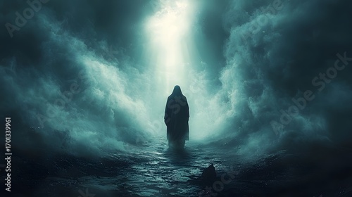A robed figure ascends a path towards a divine light through dramatic ethereal clouds