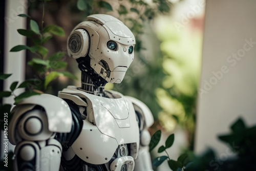 a robot a service robot, at a house, domestic help and gardener, humanoid android with artificial intelligence. Generative AI