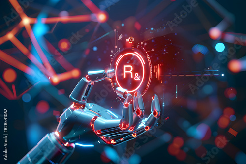 A Robot AI holding a virtual icon of the R& D concept with text "R& D" on a hologram screen, with his hand showing a digital symbol for development and innovation in business technology.