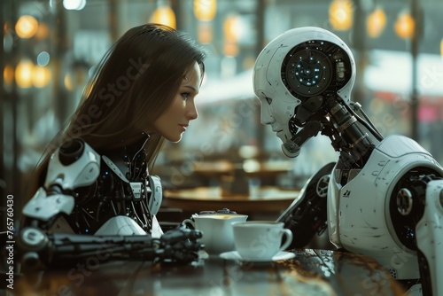 a robot and human couple in a heartfelt conversation over coffee detailed facial expressions