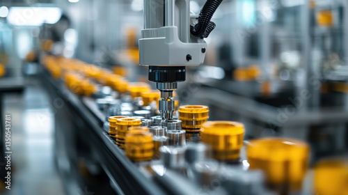 A robot arm is moving along a production line, placing yellow plastic caps on a conveyor belt in a manufacturing plant.