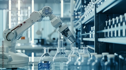 A robot arm reaches over glass containers in a sleek, futuristic lab setup, symbolizing advanced technology and innovation.
