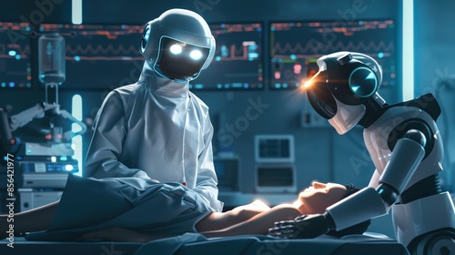 A robot is assisting a surgeon in a hospital. The robot is white and has a human-like face. The scene is set in a hospital operating room, with the robot and the surgeon wearing surgical gear