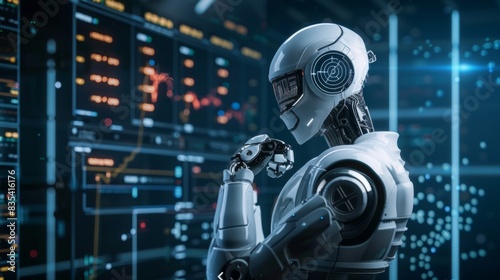 A robot is positioned in front of a wall, showcasing its mechanical features. The setting is stark and industrial.