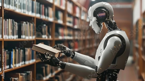 A robot is reading a book in a library. The robot is holding a book in its hand and he is enjoying the reading experience. Concept of curiosity and wonder