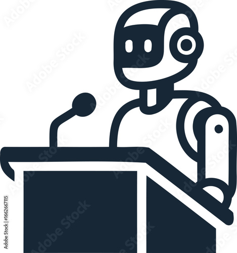 A robot stands confidently at a podium, engaging an audience about the latest advancements in technology during a vibrant conference showcasing innovation and integration.