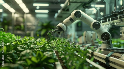 a robotic arm caring for green plants in an indoor farm, showcasing the seamless integration of technology and agriculture for sustainable food production amidst futuristic design elements.
