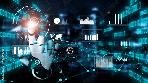 A robotic hand engages with digital interfaces, presenting data insights and visualizations in a futuristic setting, symbolizing advanced technology and AI applications. Xenic