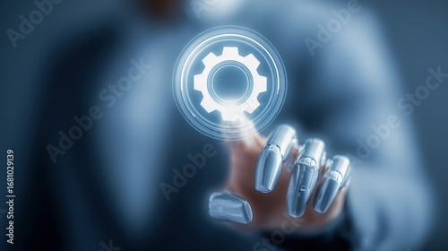 A robotic hand interacting with a digital gear icon, signifying innovation in technology.