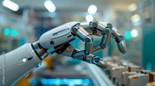 A robotic hand with intricate mechanical parts reaching out in a futuristic factory setting.