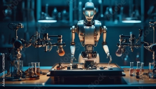 A robotic lab technician manipulates scientific equipment in a blue-lit laboratory filled with glassware and tools.. AI Generation