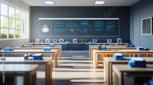 A robotics classroom with assembled robots, electronic components, and instruction manuals.