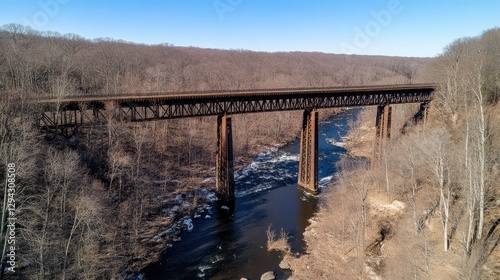 A robust iron bridge spans a river in winter, its elegant structure harmonizing with the barren, tranquil landscape.