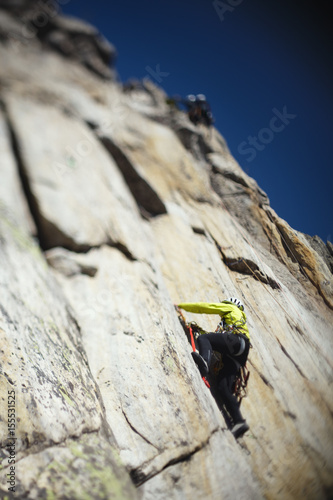 A rock climber climbs the wall in the mountains. Tilt-shift effect.