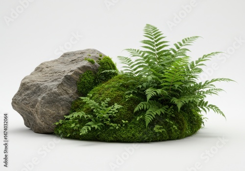 A rock with moss and ferns against a plain backdrop in a studio setting