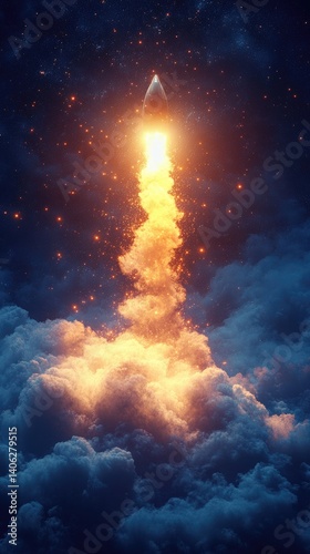 A rocket ascends through illuminated clouds, bright light trail against a dark, starry sky