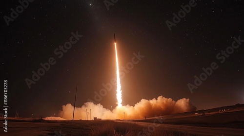 A Rocket Launches Into the Night Sky With a Long Trail Behind It - Generative AI
