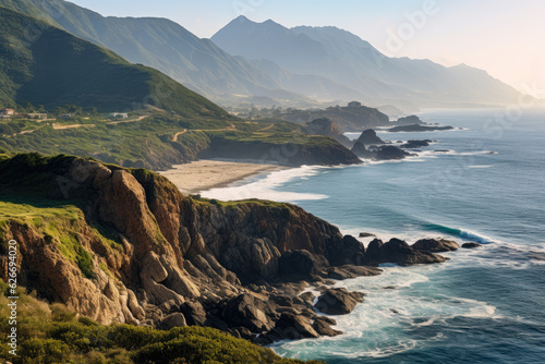 A rocky coastline with a sandy beach and a mountain range in the background. The water is a beautiful blue-green color and the sky is clear