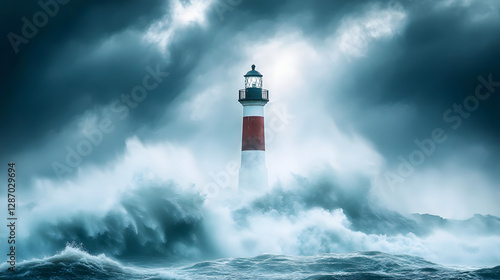 A rocky island with a dramatic lighthouse standing tall against crashing waves during a powerful storm.