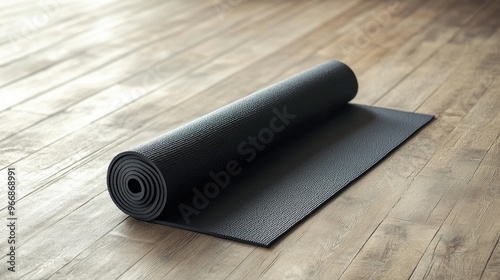 A rolled yoga mat placed neatly on a wooden floor, with space for copy promoting fitness.