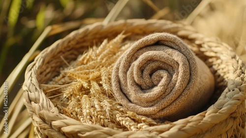 A rolled-up pair of hemp-cotton socks placed inside a small woven basket with dried wheat stalks.