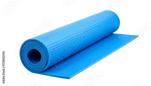A rolled-up vibrant blue exercise mat on a white background, partially unrolled, showcasing its textured surface