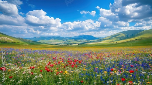 A rolling countryside dotted with vibrant wildflowers and fields stretching into the distance.