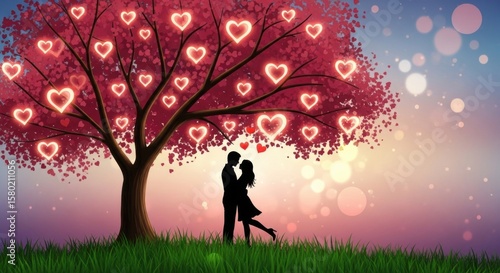 A romantic couple embracing under a tree adorned with glowing hearts