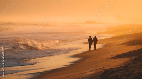 A romantic couple enjoying a walk on the beach at sunset, creating a peaceful atmosphere.