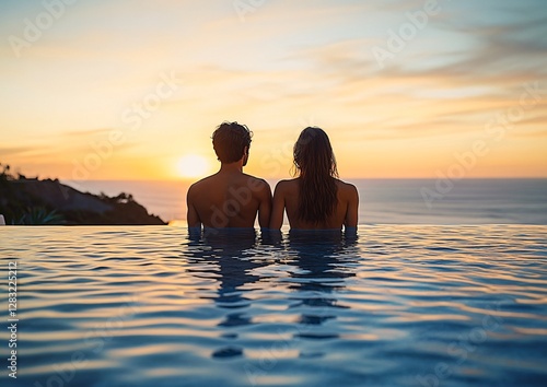 A romantic couple enjoys a tranquil sunset in an infinity pool, perfect for travel ads, honeymoon promotions, or wedding invitations.