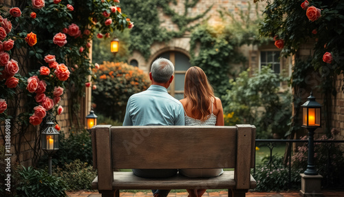 A romantic couple sits closely together on a wooden bench surrounded by blooming roses and glowing lanterns, capturing love and intimacy for Valentine's Day.
