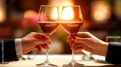 A romantic couple toasting with glasses of red wine, set against a warm, glowing sunset.