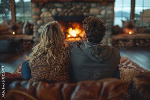 A romantic scene featuring a couple in an embrace, overlooking a roaring fireplace in a homey setting