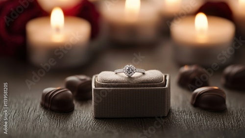 A romantic scene featuring a diamond ring in a velvet box, surrounded by soft candlelight and chocolates, perfect for engagements or celebrations.