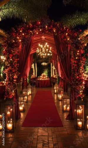 A romantic scene unfolds with flickering candles illuminating a lavishly red carpeted aisle, inviting love and enchantment on this special day.