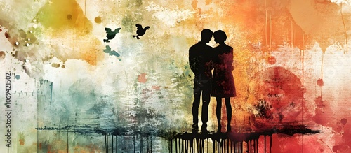 A romantic silhouette of a couple standing close together against a vibrant, abstract watercolor background.