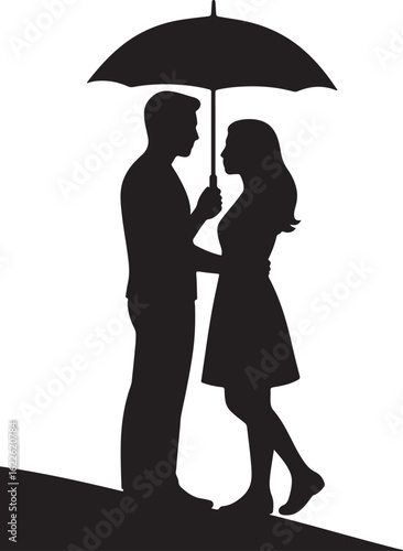 A romantic vector silhouette illustration of a couple kissing under an umbrella